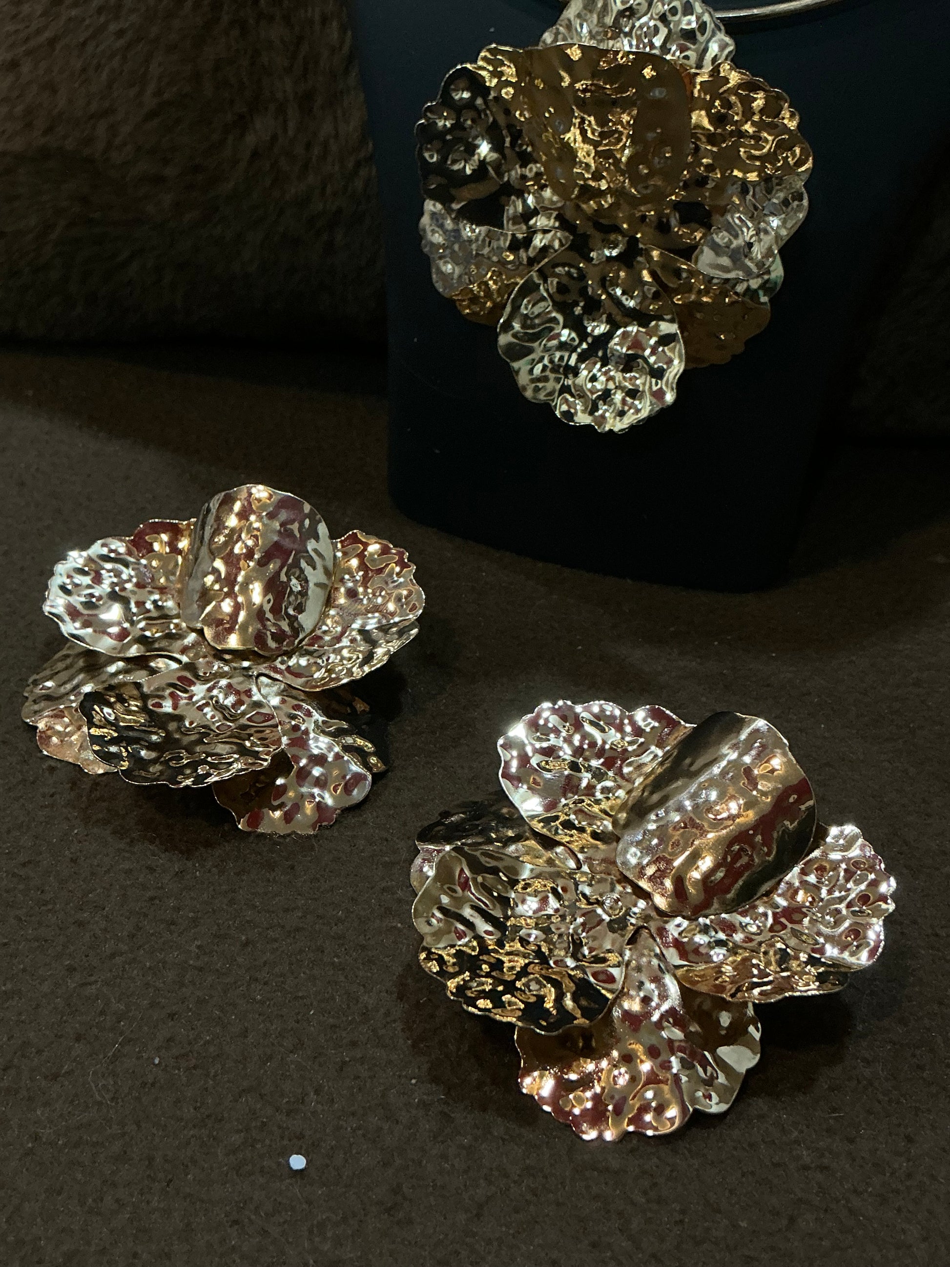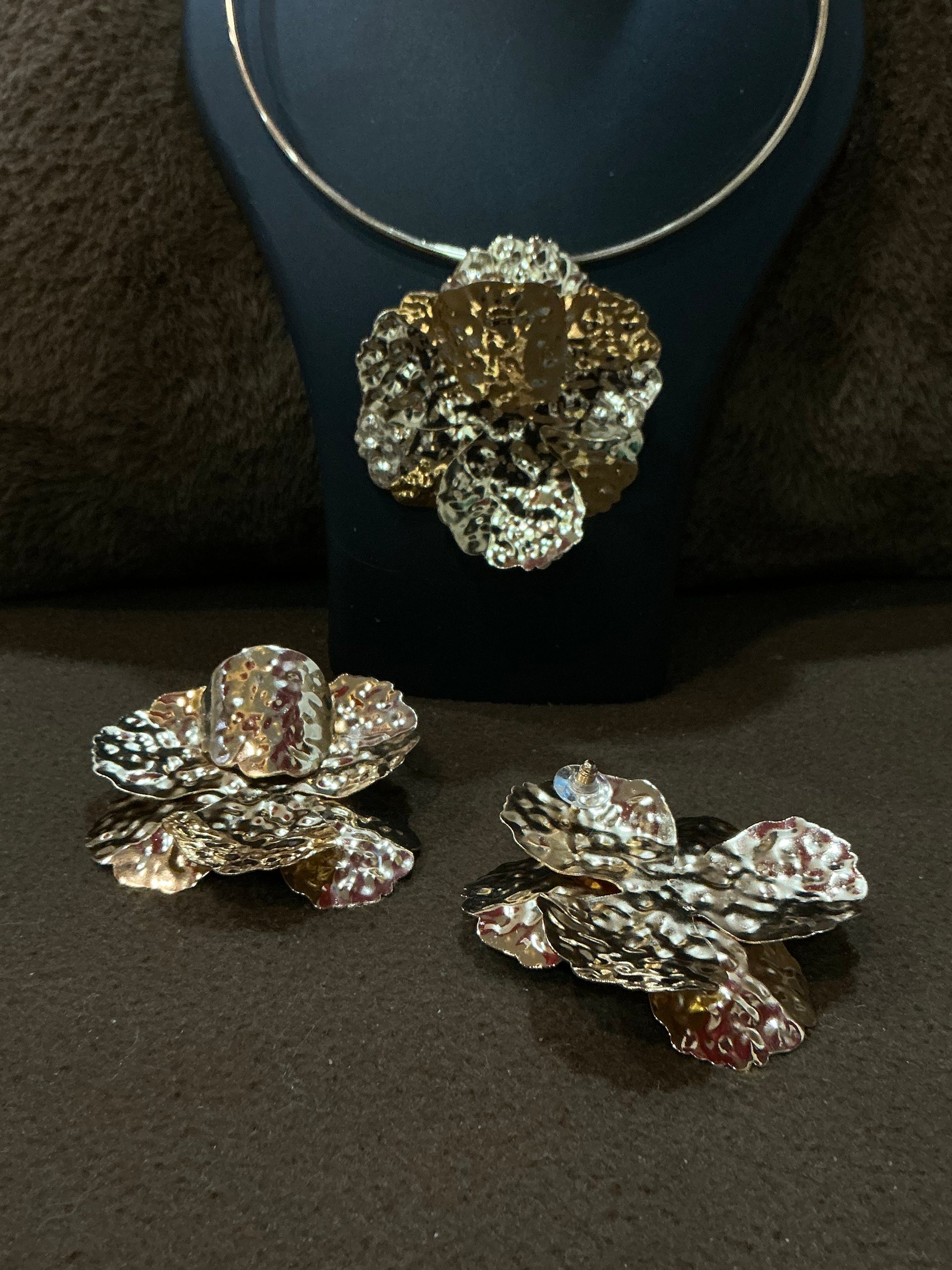 The choker showcases a dramatic flower centerpiece on a sleek metallic band, while the matching earrings mirror the same sculptural style for a powerfully coordinated look. Ideal for weddings, festive occasions, or high-glam moments, this set instantly elevates any outfit — be it a saree, gown, or structured blazer.