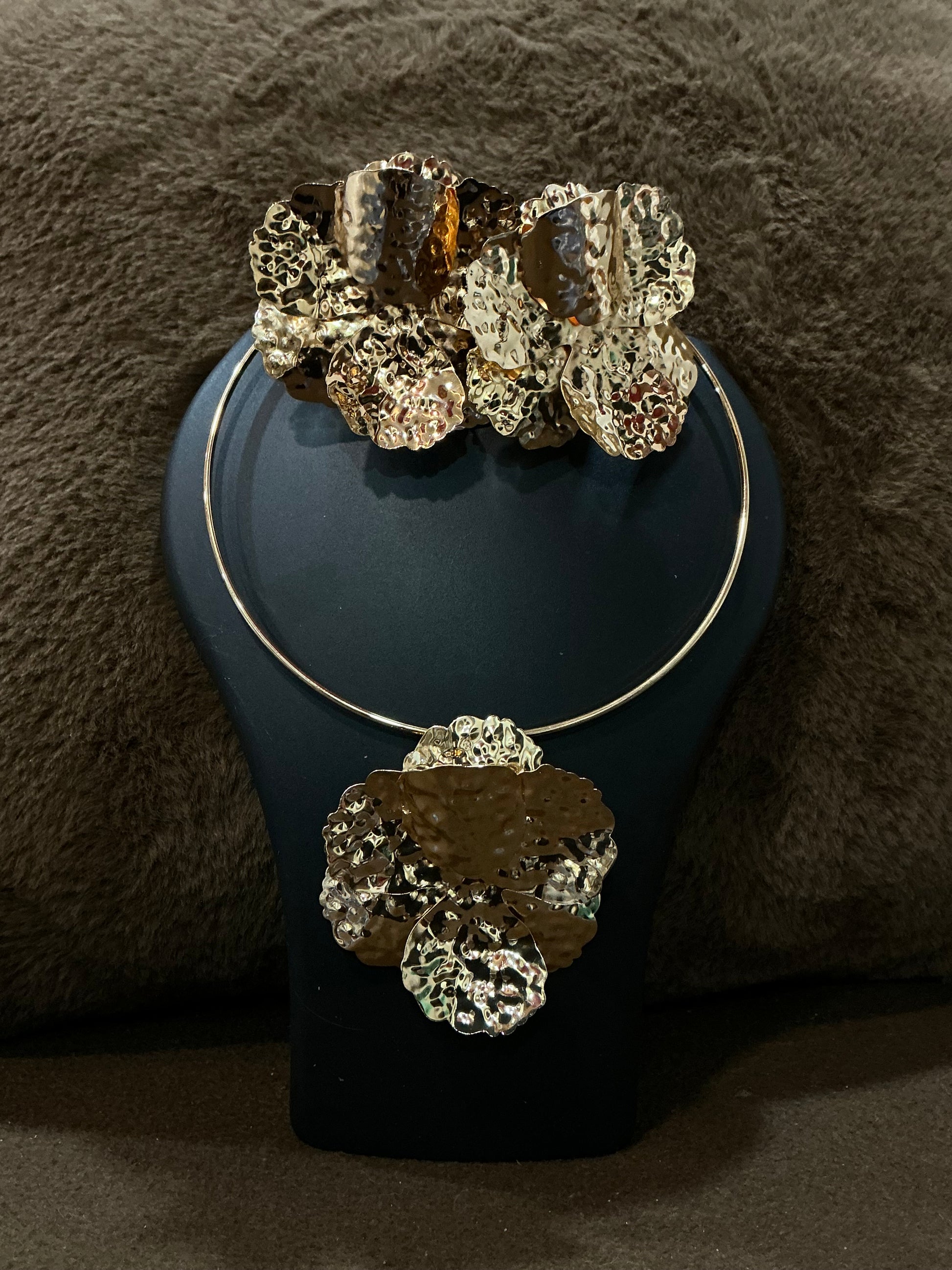 Turn heads and steal the spotlight with the Gilded Petals Choker Set — where bold design meets modern glam. This radiant set features a striking floral motif crafted in a gleaming gold-tone finish that catches the light beautifully from every angle.