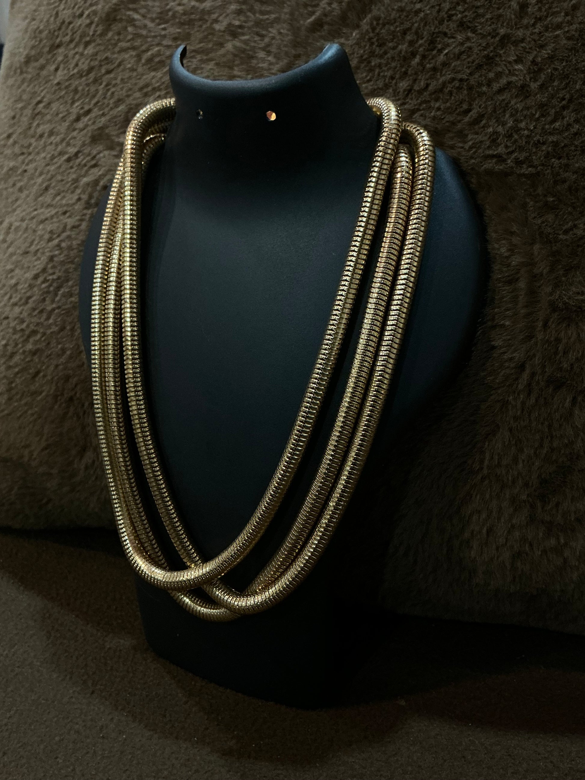 Elevate your statement game with the Golden Glide necklace, a chic multi-layered stunner crafted for bold women who love minimal glam. Featuring three fluid snake-style metallic strands in a brushed antique gold finish, this piece is all about effortless sophistication.