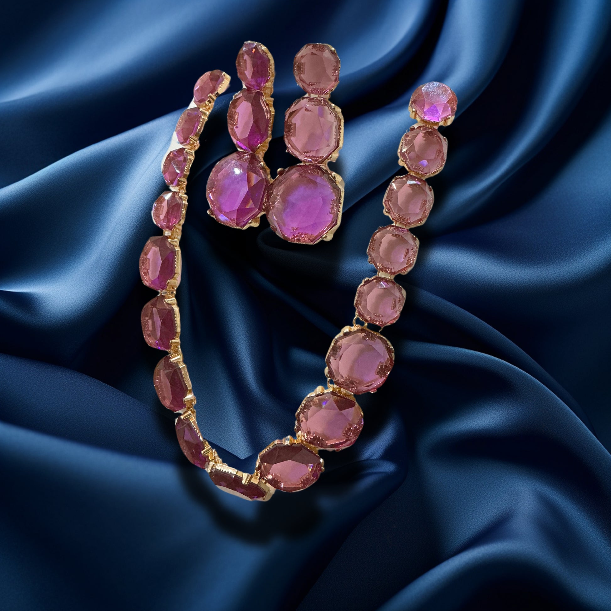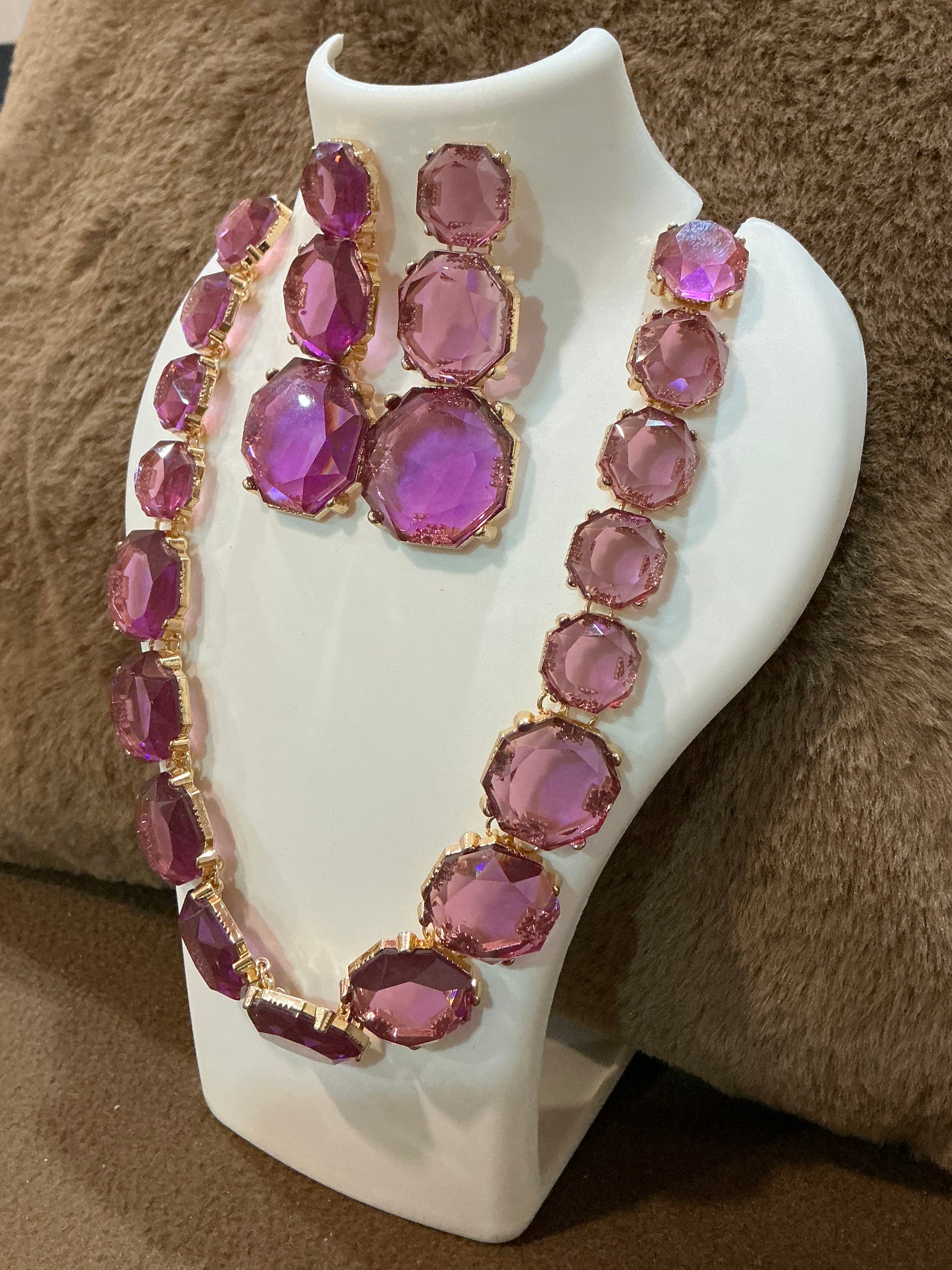 Drape yourself in regal elegance with this purple gemstone necklace and earrings set, a stunning statement in amethyst-inspired tones. Featuring large, faceted cushion-cut stones set in a rich gold-tone frame, this set brings instant glamour to any festive, bridal, or evening outfit. The necklace boasts a bold arrangement of sparkling violet and lavender stones, while the matching drop earrings complete the look with grace and symmetry.
