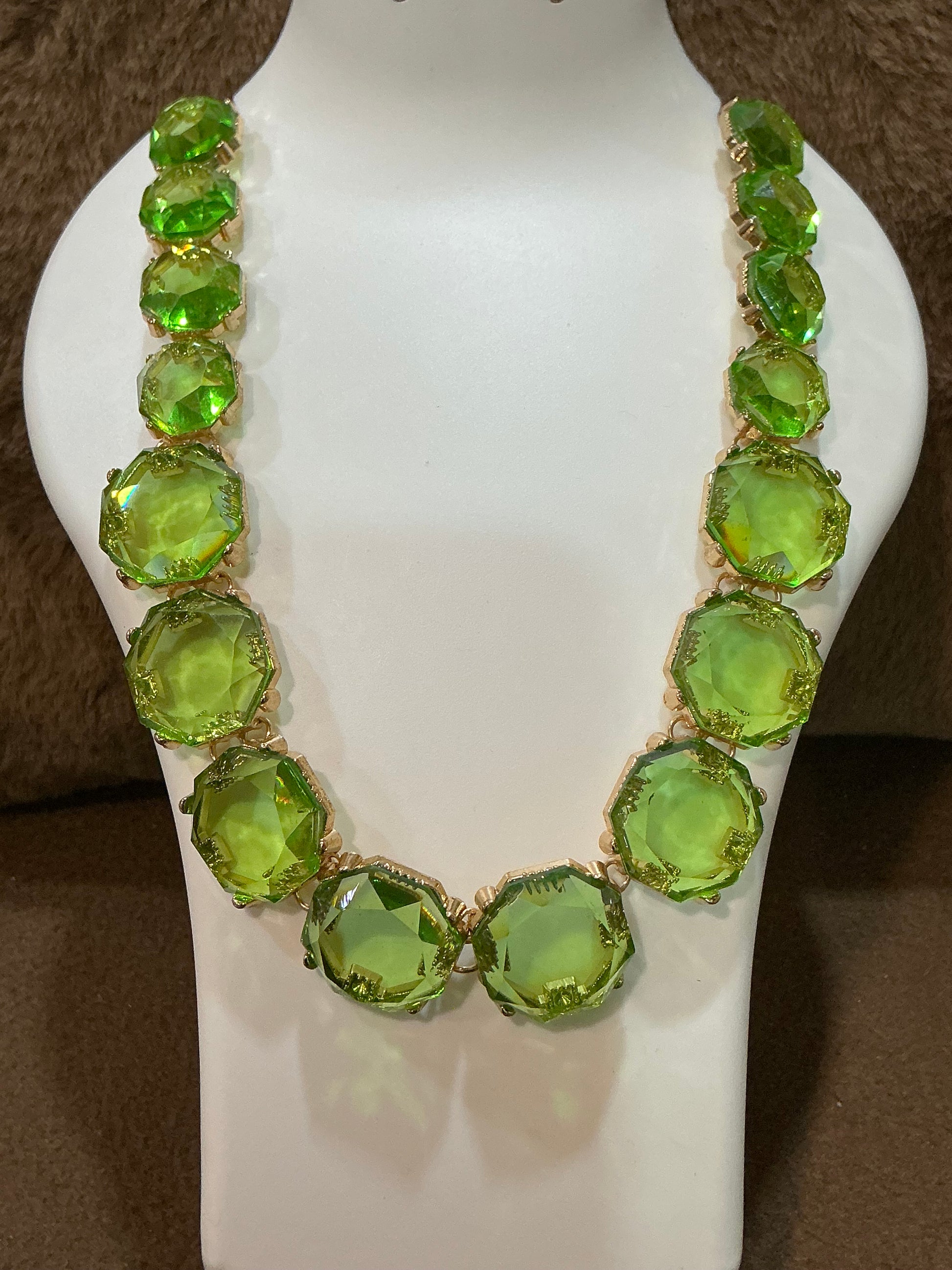 Drape yourself in pure elegance with this luxurious green gemstone necklace and earrings set, meticulously crafted to turn heads. Featuring brilliantly faceted, oversized green stones set in rich gold-toned frames, this regal set captures the essence of timeless glamour and modern sophistication. Whether youβre dressing up for a wedding, party, or festive celebration, this bold jewelry set brings unmatched charm and brilliance to your look.